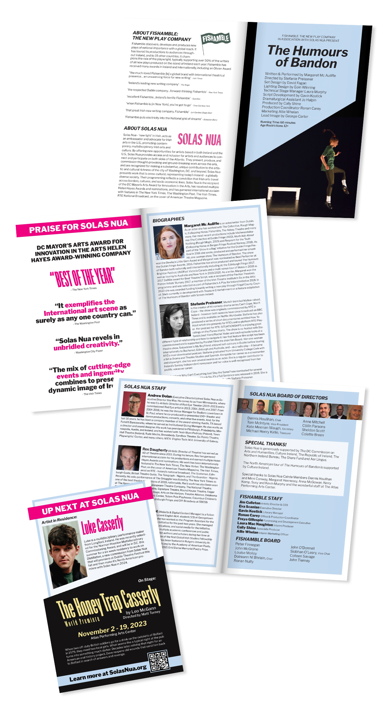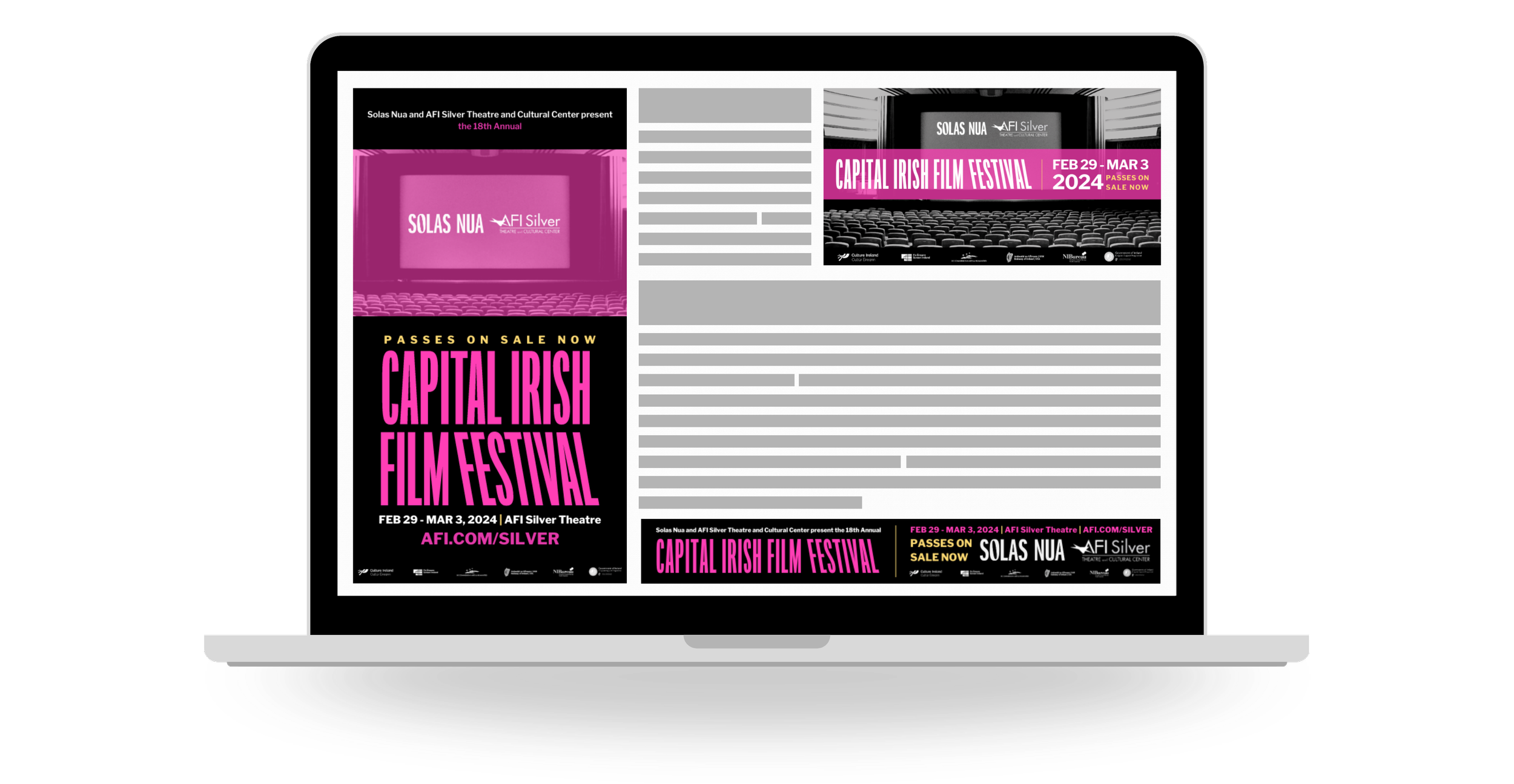 For Solas Nua, I developed expressive visual systems across print and digital for both their Capital Irish Film Festival (CIFF) and multiple theatrical productions. For CIFF, I evolved the festival’s established brand into fresh seasonal key art and campaign assets, building a cohesive visual presence across formats. For stage productions, I designed posters and programs in close collaboration with the Artistic Director and Creative Director, translating conceptual vision into bold, audience-facing design that reflected each performance.