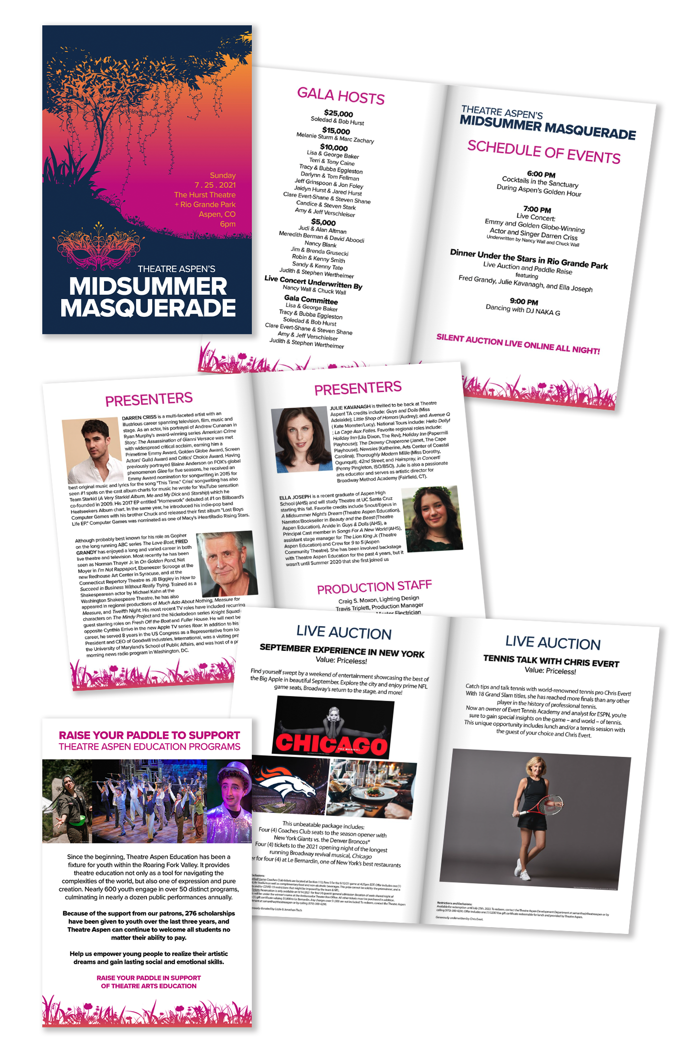 For Theatre Aspen’s Midnight Masquerade Gala, I designed a cohesive visual experience that carried the event from first impression to final toast. I created a suite of print and digital materials including event posters, run-of-show signage, seating charts, auction item highlights, bidding cards, menus, digital ads, and event program. Each piece worked together to build an immersive, polished atmosphere, balancing elegance and flair while guiding guests seamlessly through the evening.
